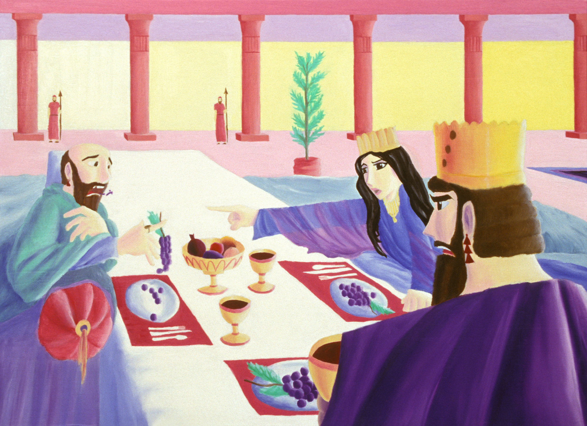 Oil painting of Queen Esther accusing Haman in front of  King Ahasuerus. Inspired by Esther Chapter 7.