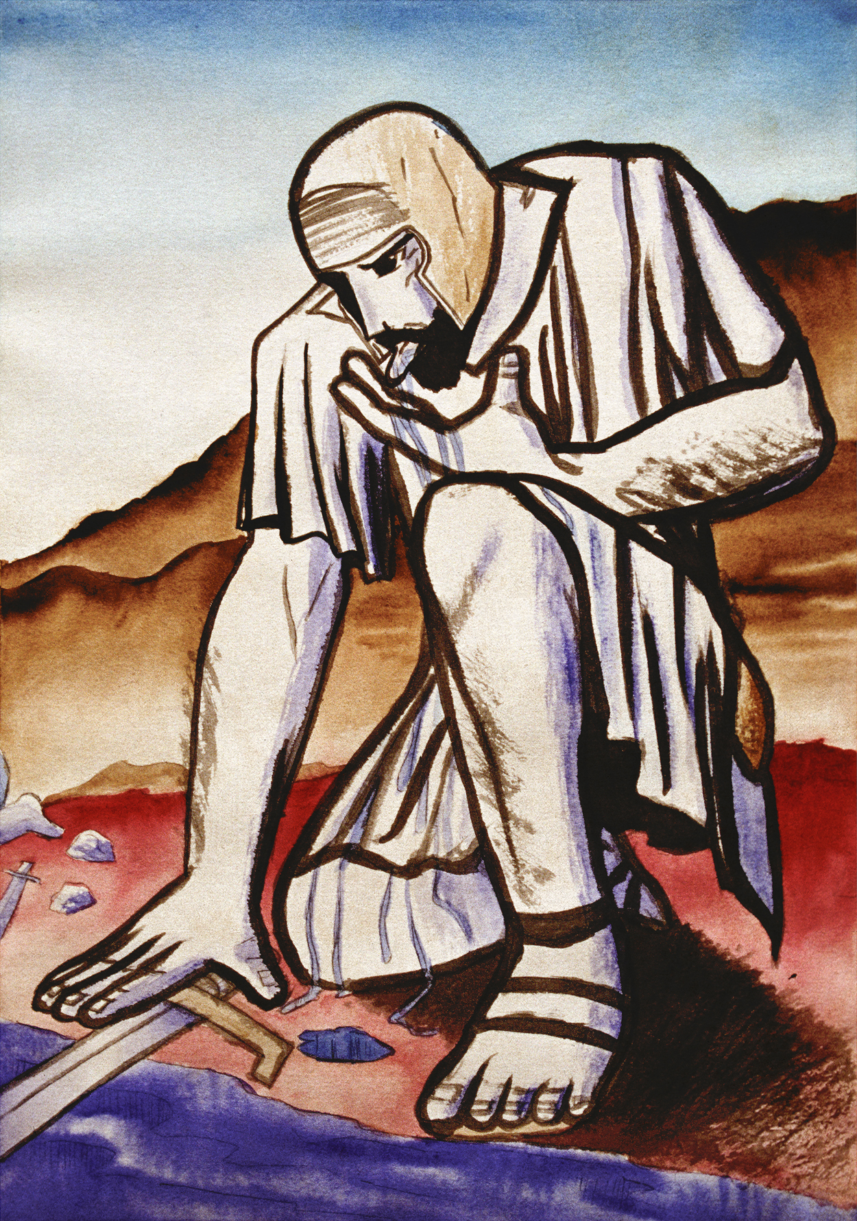 Watercolor of a soldier from Gideon's army, sipping water by the stream, but keeping a watchful eye. Inspired by Judges Chapter 7.