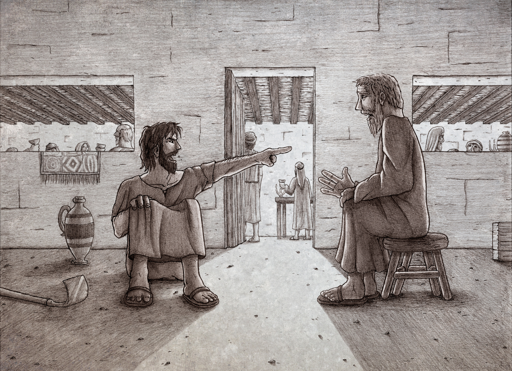 Pencil drawing of the Prodigal Son's older brother pointing at the father, accusing him of unfairness between him and his brother. Inspired by Luke Chapter 15.